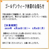 誠に勝手ながら、弊社では下記日程をゴールデンウィーク休業とさせていただきます。【休業期間】2019年 ...