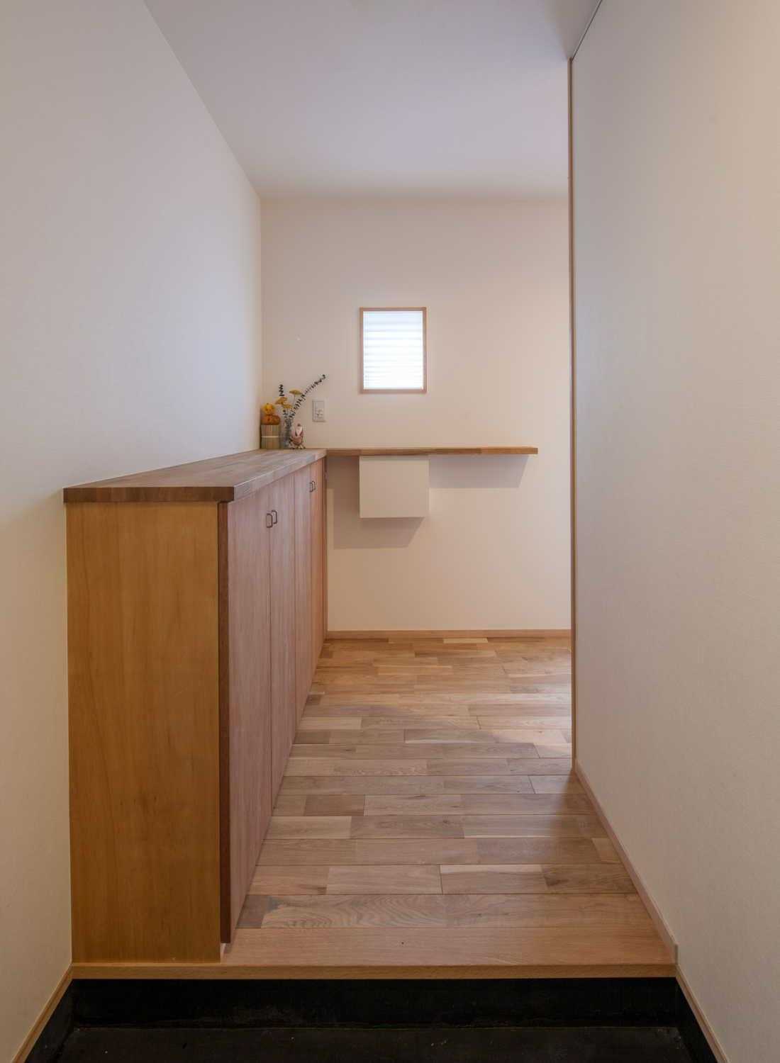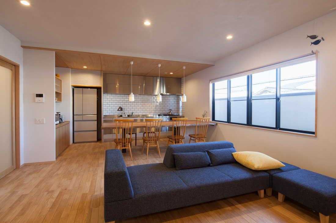 オープンなキッチンと直結したカウンタータイプの大きな無垢材のダイニングテーブルがあり、
